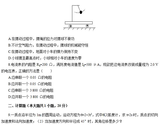 7.一辆小车装一单摆,小车放在光滑的水平面上,如图所示.开始时将摆球拉至某一高度(小车和摆球都静止).当将摆球无初速释放后,做自由摆动时( )