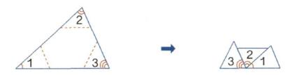 三角形的三个内角拼在一起是一个平角,得出三角形内角和是180°。