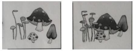 教师展示有遮挡关系的蘑菇组合图片和无遮挡关系的组合图片,引导学生赏析,并提问两幅图之间有怎样的区别?