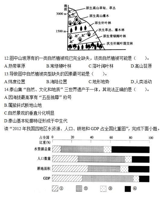 下图为某山脉山坡的垂直植被分布图,读图完成下列各题。