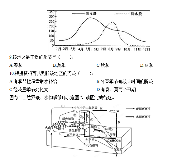 下图为我国某地区降水量与蒸发量的季节变化曲线图,该地区降水量为682.4mm,可能蒸发量为1802.4mm,读图回答下列各题。