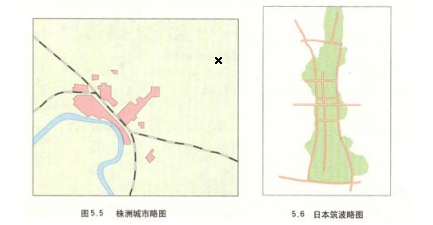 交通条件对聚落空间形态的影响很大,表现在据罗空间形态往往沿交通干线(铁路、公路、河道等)扩展,这些交通干线也成为聚落的主要发展轴。例如,株洲市就是沿铁路发展起来的,是个典型的“火车拉来的城市”(如图5.5)。日本著名的科学筑城波市,一条长达9千米的中轴路,决定了城市南北瞎唱的带状形态(图5.6)。