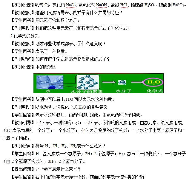 【教师引导】我们在之前已经了解了元素可以用元素符号来表示,那么我们前面学习的氧气、二氧化碳这些由元素组成的各种单质和化合物怎样来表示呢?带着这个疑问我们进入今天的内容。