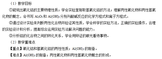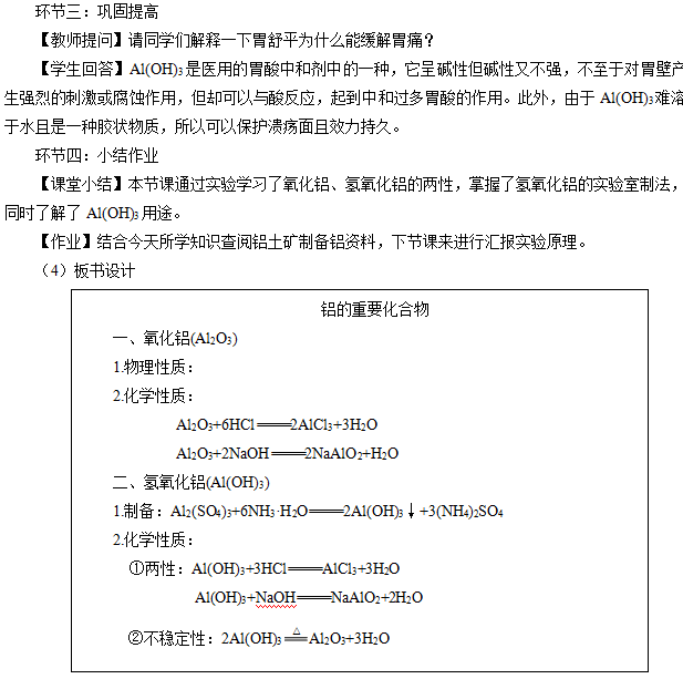 【教师引导】其实铝制品在我们的生活中被广泛应用的原因就是由于氧化铝的保护作用,那氧化铝除了上述性质之外还具有什么性质?铝的重要化合物除了氧化铝之外还有氢氧化铝,那氢氧化铝又具有怎么的性质?我们这节课一起来学习下。