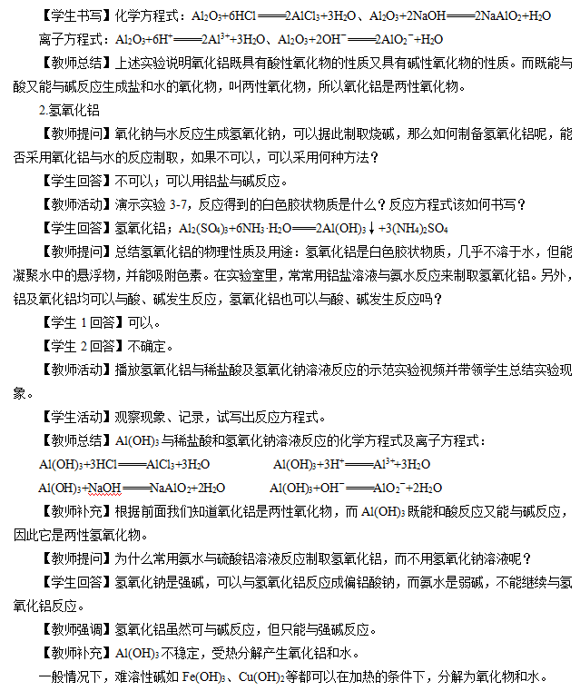 【学生回答】根据前面学习的铝单质的性质,推测出氧化铝可能既可以与酸反应,又可以与碱反应。所以用酸或者碱均可以去除这层氧化膜。