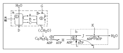 27.如图表示一个水稻叶肉细胞内发生的部分代谢简图。图中①~⑤表示反应过程,A~L表示细胞代谢过程中的相关物质,a、b、c表示细胞的相应结构。请据图作答: