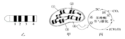 18.绿色植物是主要的能量转换者是因为它们均含有叶绿体(图甲)这一完成能量转换的细胞器,图乙是图甲中的色素分离结果,图丙是在图甲④结构中进行的生化反应,①~④分别代表图甲中叶绿体的结构.下列相关叙述中,不正确的是( )。