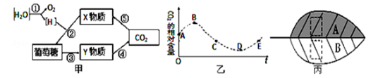 (1)甲图中X物质是________;④过程是在________中进行的;①~⑤过程中,能使ADP含量增多的过程是________(写标号)。