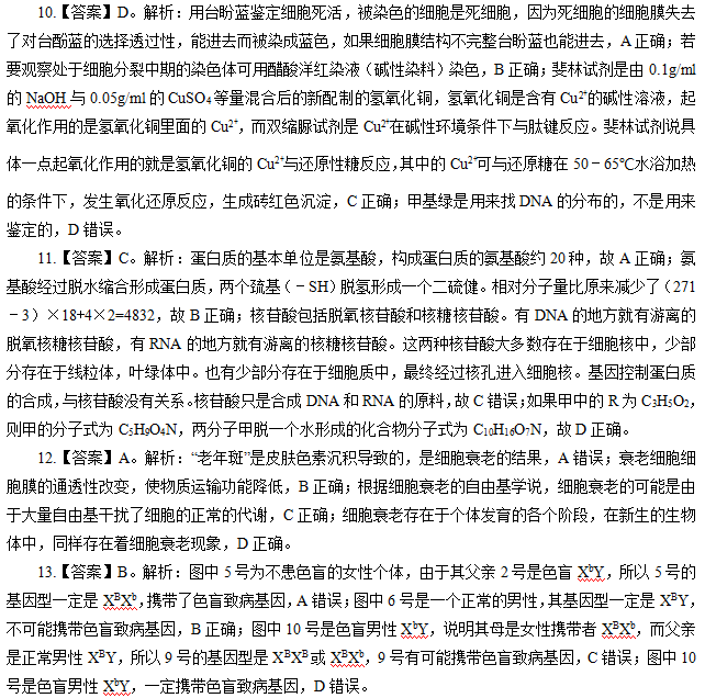 9.【答案】D。解析:硝化细菌属于原核生物,细胞中含有糖类,A错误;硝化细菌是原核生物,没有染色体,没有有性生殖方式,其可遗传变异的来源只有基因突变,B错误;硝化细菌是原核生物,具有细胞壁、没有成形细胞核,具有核糖体一种细胞器,C错误;硝化细菌和小麦的新陈代谢类型都是自养养需氧型,但是所利用的能量来源不同,小麦利用的是光能,硝化细菌利用的能量是氨氧化释放的化学能,D正确。