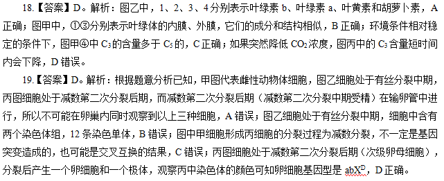 16.【答案】B。解析:无籽番茄是利用生长素促进子房发育成果实的原理培育出来的,其遗传物质并没有改变,因此该性状不能遗传,A错误;无籽番茄是利用生长素促进子房发育成果实的原理培育出来的,这种变异是不可以遗传的,扦插后长出的植株所结的果实中有种子,B正确;无籽西瓜是用染色体变异的原理培育的,其遗传物质已经发生改变,长成的植株所结果实中没有种子,C错误;植株子房壁细胞为体细胞,含有三个染色体组,D错误。