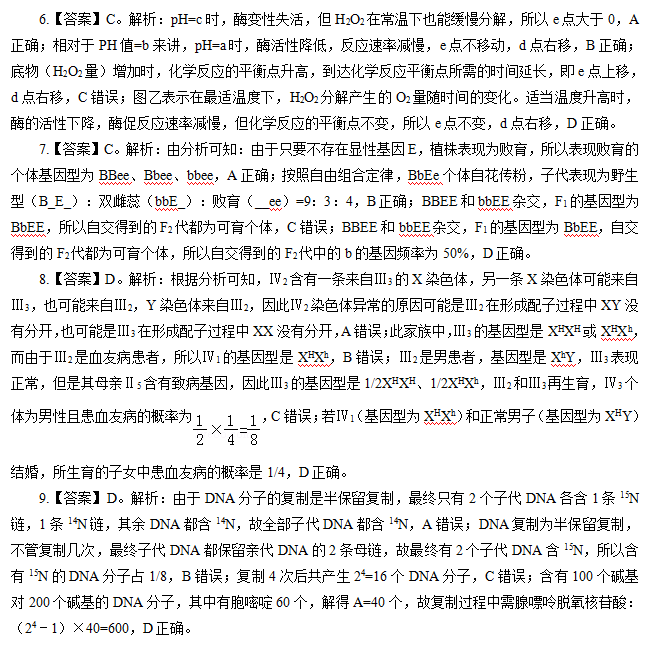 5.【答案】A。解析:在绿叶中色素的提取和分离实验中,需要用无水乙醇来提取色素,分离色素用的是层析液,A错误;在脂肪鉴定实验中,可用体积分数为50%酒精溶液洗去浮色,B正确;有丝分裂实验中用15%的盐酸和体积分数95%的酒精制备解离液,使组织细胞相互分离,C正确;DNA粗提取实验中,用体积分数为95%的冷酒精提纯DNA,冷却的95%酒精能够降低温度促进DNA的析出,同时也能够溶解杂质,D正确。