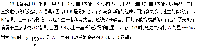 14.【答案】C。解析:被消费者同化的能量是B,所以从麻风树注入下一营养级的能量传递效率为B/N,A正确;D是指呼吸作用消耗的能量,B正确;B是指消费者(第二营养级)的同化量,包括于生长发育和繁殖的能量和呼吸作用消耗的,C错误;该图解中包括了生产者、消费者和分解者,没有非生物的物质和能量,D正确。