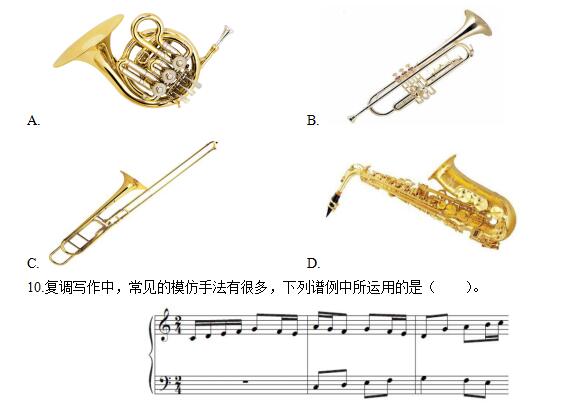 9.室内乐指由一件或几件乐器演奏的小型器乐曲,主要指重奏曲和小型器乐合奏曲。其中铜管五重奏作为其中较为常见的室内乐形式,下列选项中不属于铜管五重奏成员的是( )。