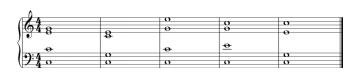26.和弦排列是指和弦在纵向写作时各个声部之间的音程距离关系。下列谱例当中属于密集排列的有( )个。