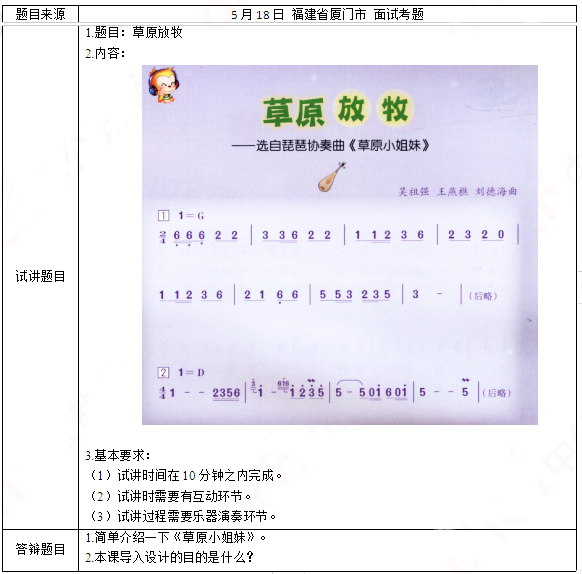 2019上半年小学音乐教师资格面试真题及答案(第二批)