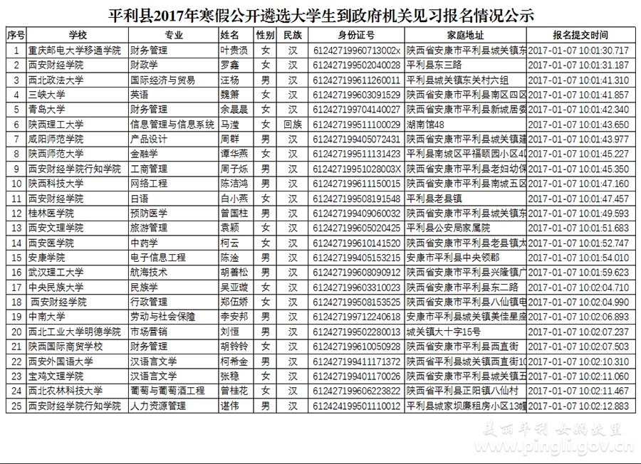 上一篇:2017岚皋县遴选大学生寒假到县政府机关见习活动网上报名情况公示 下一篇:2017陕西高速公路建设集团招聘5人公告